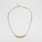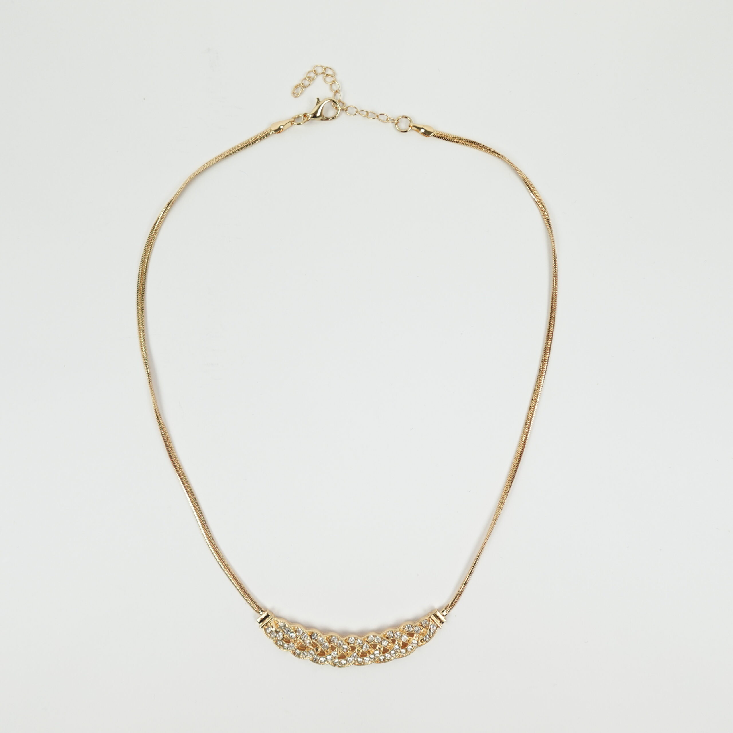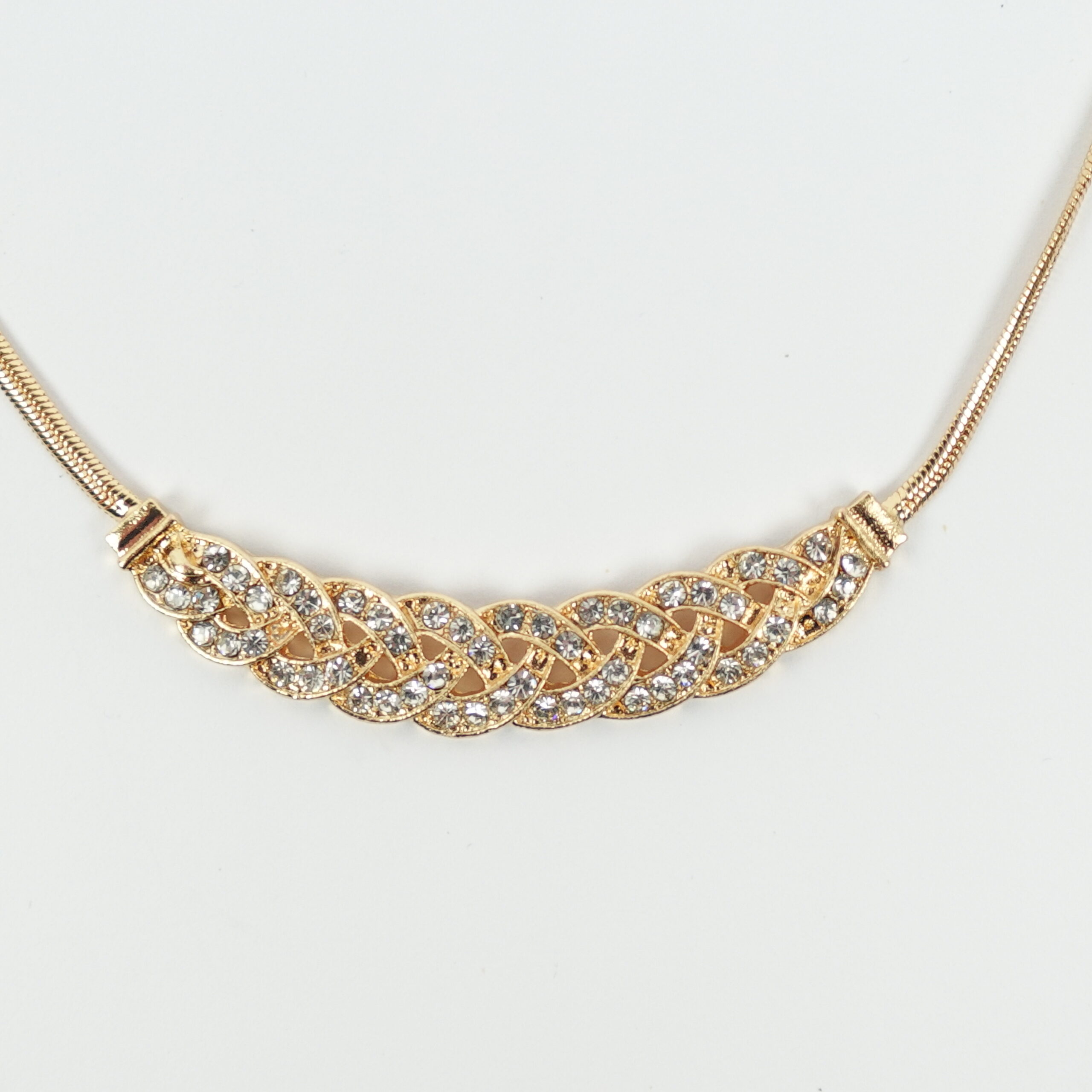 Ogrlica u žutoj pozlati. Na sredini ima privezak u formi pletenice ukražene sjajnim kristalima. Odlično se slaže uz elegante odevne kombinacije. Istaknite vašu ženstvenost izborom baš ovakve ogrlice.